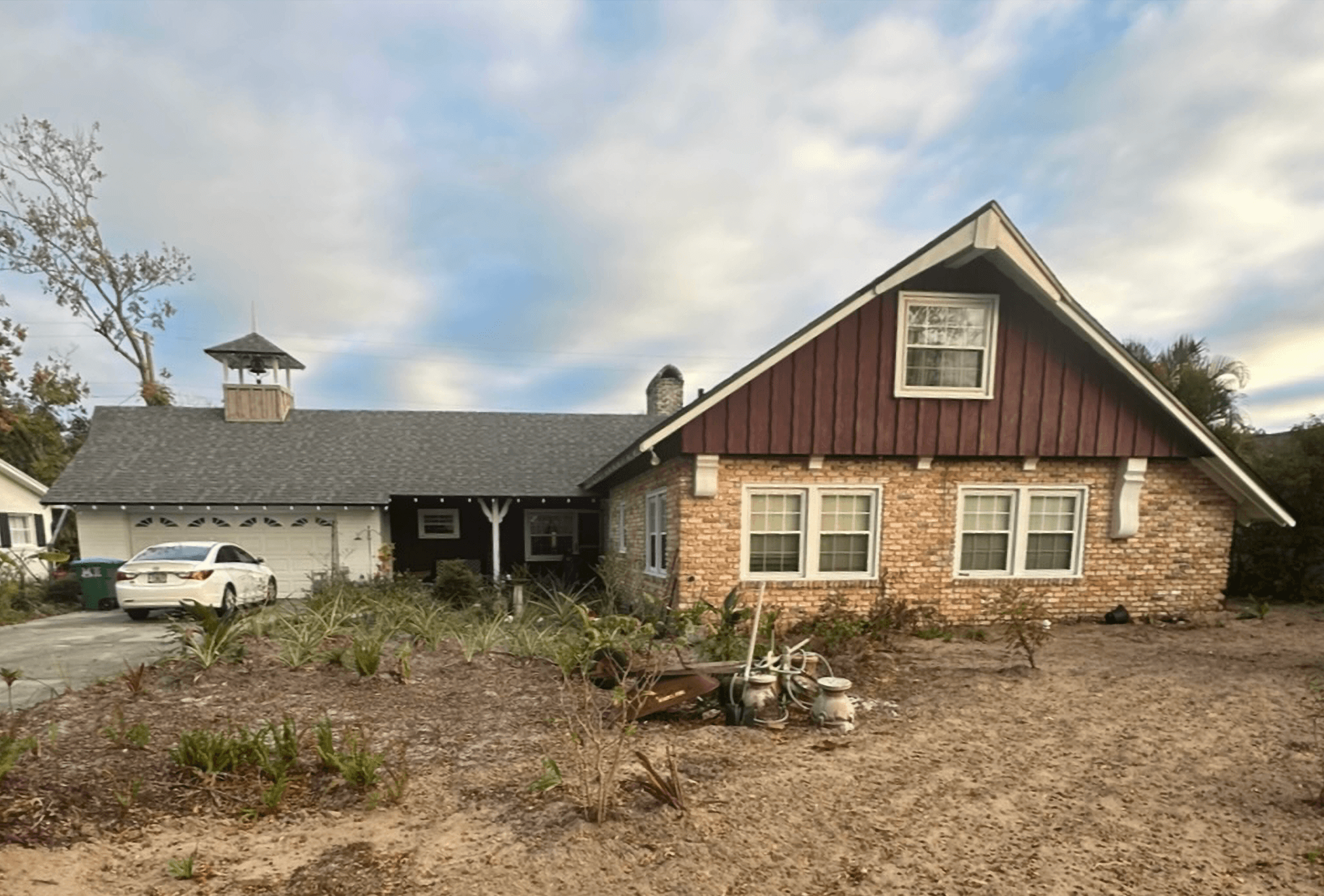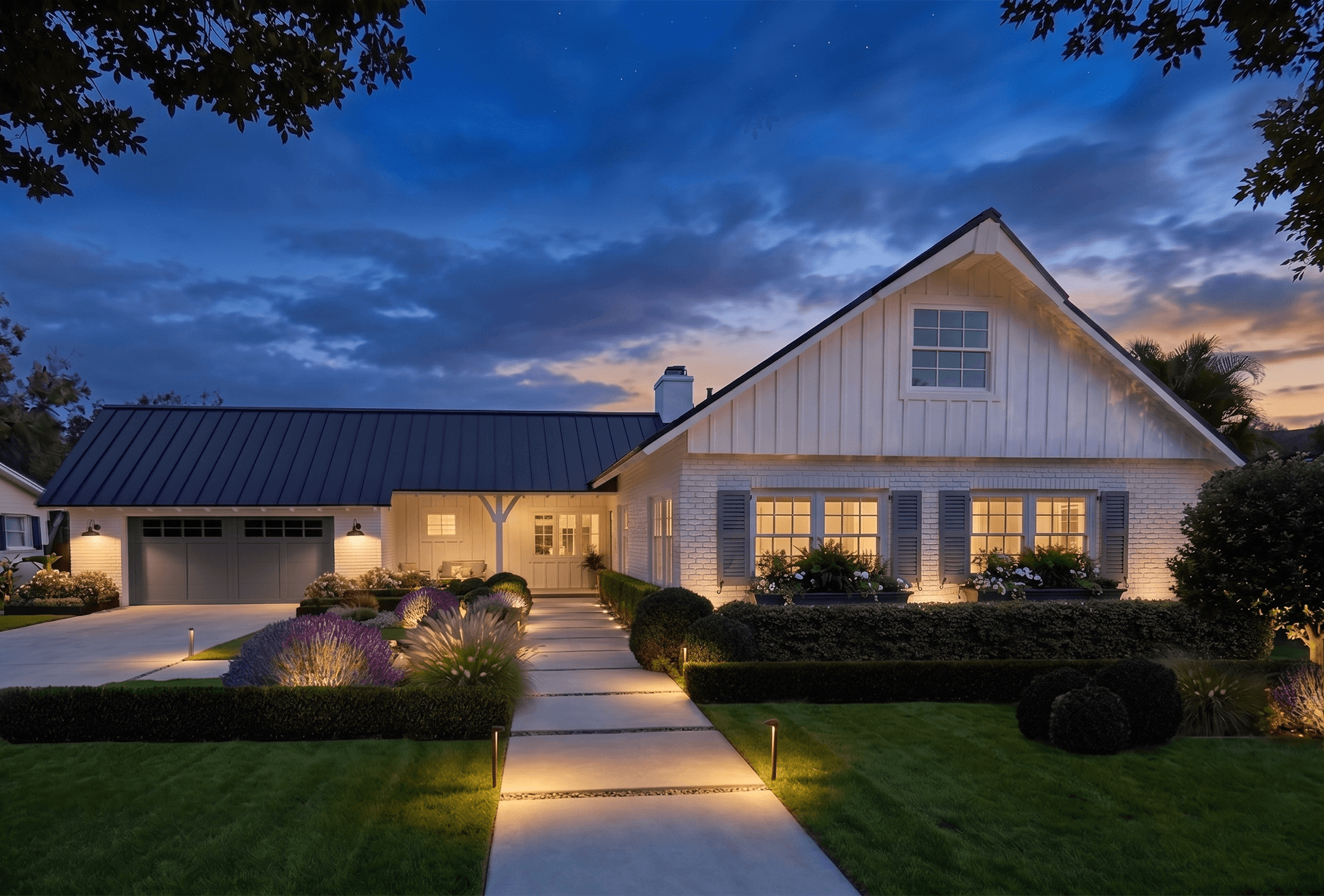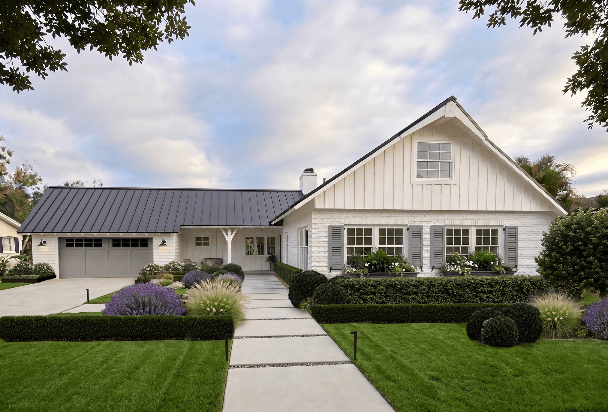 The update transforms a dated, mismatched exterior into a cohesive Modern Ranch House by streamlining the color palette and upgrading key materials. The original reddish siding and exposed brick were replaced with a warm white board-and-batten and painted brick finish, anchored by a sleek black standing-seam metal roof. Beyond the structural updates, which included removing the roof cupola and adding grey shutters with flower boxes, the most dramatic change is the total landscape overhaul, replacing a sandy, overgrown lot with a manicured lawn, structured boxwood hedges, and a modern paver walkway to blend cozy cottage vibes with a modern lines.